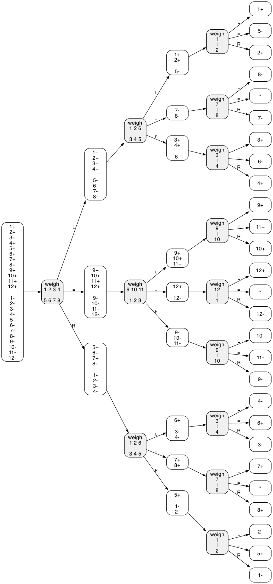 - Right pan heavier: one of 3 or 4 is heavier, or 5 is lighter, all other hypotheses are ruled out. Only 3 hypotheses out of 8 remain
