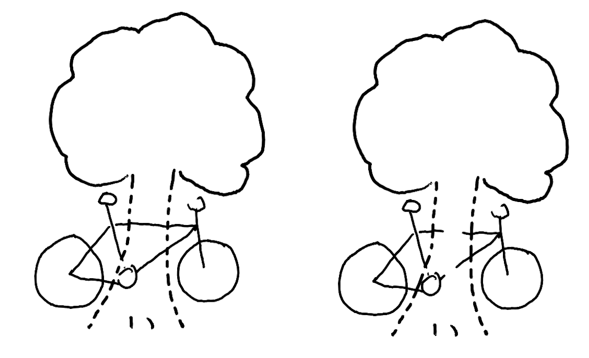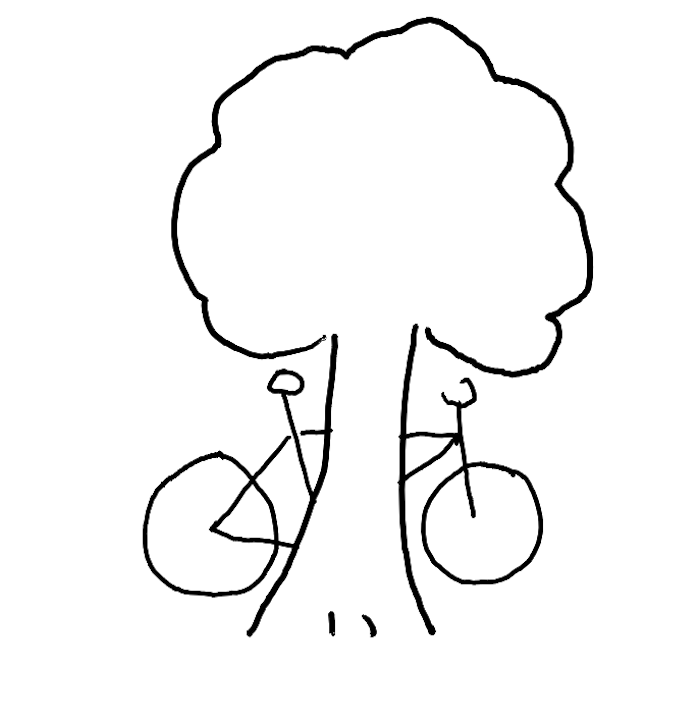 - H2: There are two halves of a bike behind a tree, giving the illusion of a single bike