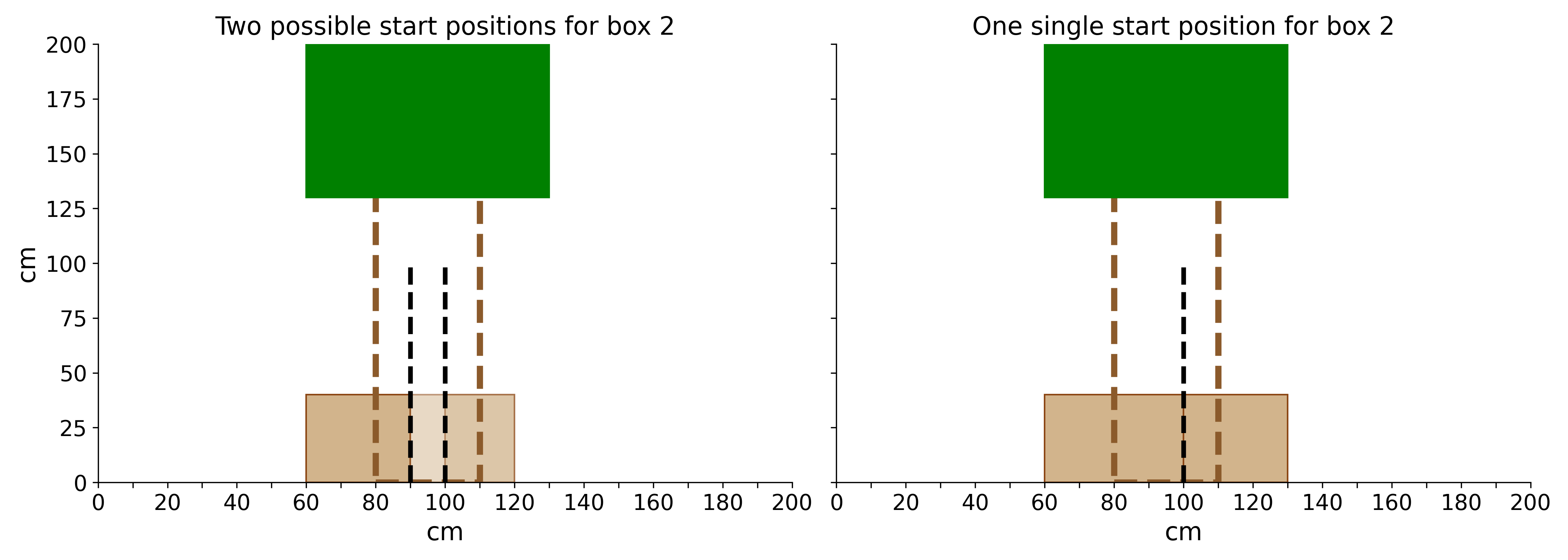 The second box now needs to start at the exact spot at which the first box ends, or on either of the two positions behind the tree if the first ends early. No overlap is tolerated.