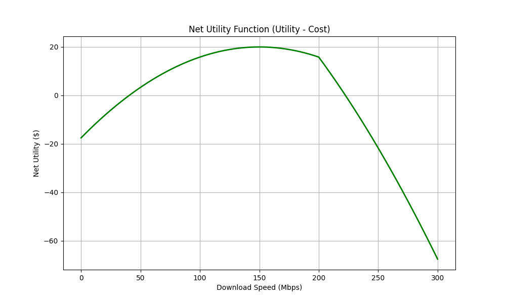 In this scenario, consumers would be maximising their utility/satisfaction minus the costs they pay. The net utility function is plotted below.
