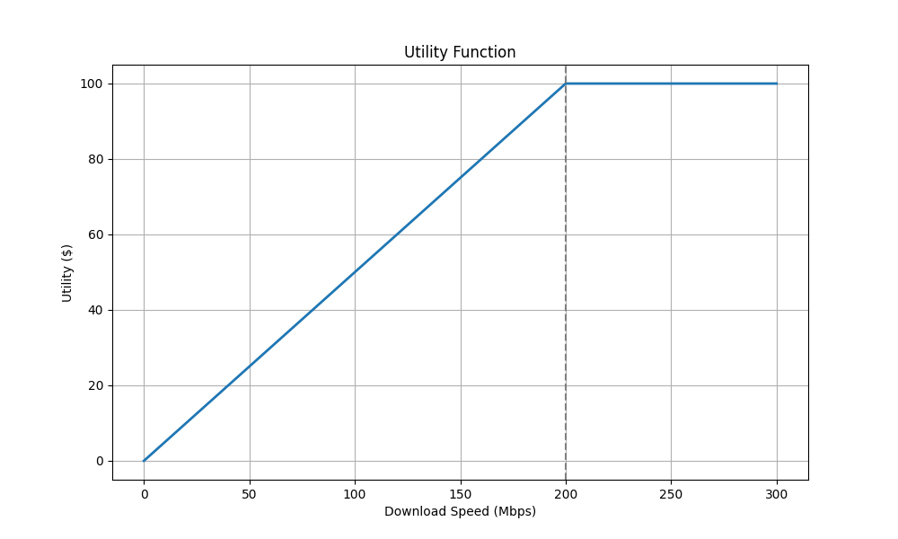 Let’s imagine that a customer values each additional Mbps of download speed at $0.5 until 200 Mbps, and $0 beyond that.